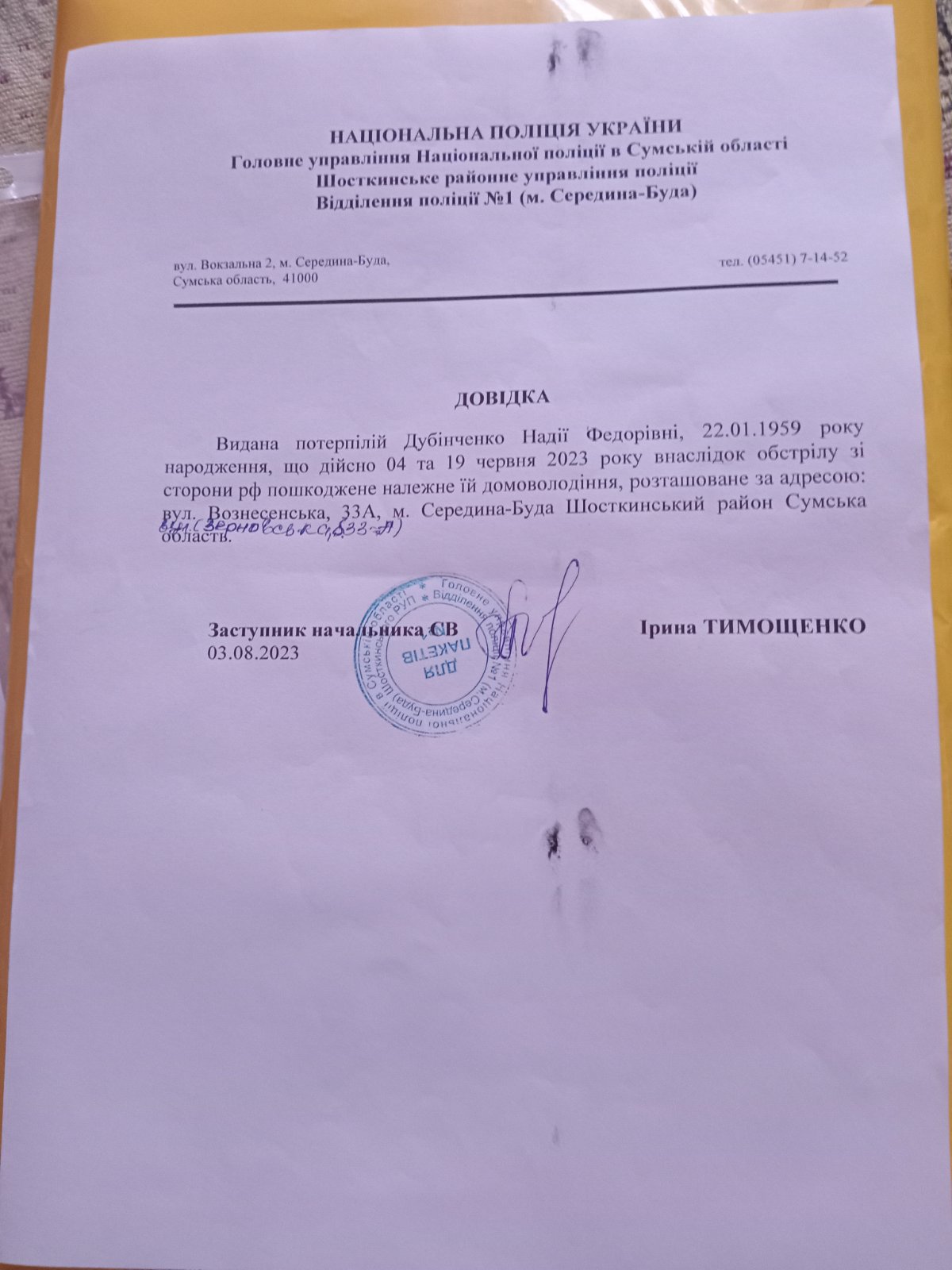 Під час ворожих обстрілів в її будинку пошкоджено три вікна, одне вікно в літній кухні, паркан, сарай. Сім'я була вдома, вони не постраждали, але були дуже налякані. Самотужки закрили вікна ДСП та плівкою. Звертаються до всіх небайдужих допомогти у відновленні будинку.