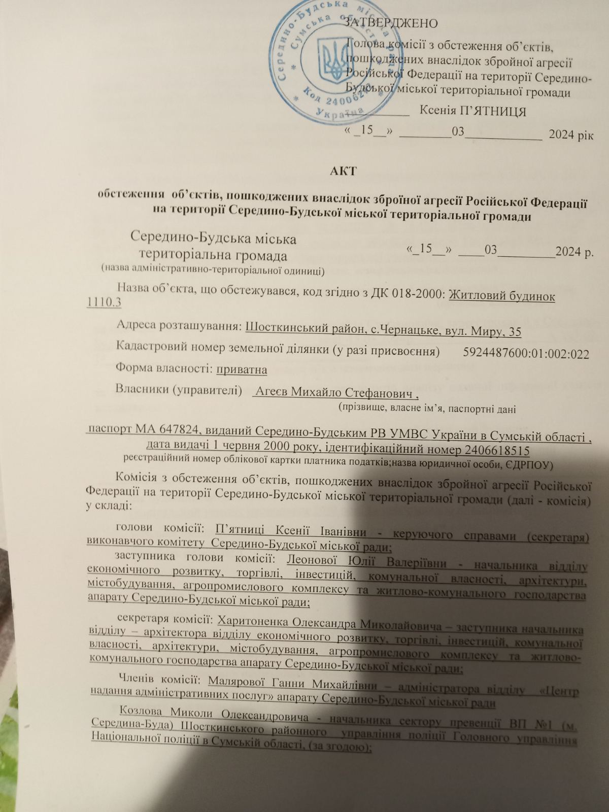 27 лютого 2024 р. родинний будинок двічі потрапив під ворожий обстріл, спочатку о 3:00 годині ранку, згодом - о 18:00. Загалом було пошкоджено 11 вікон, вхідні двері, паркан та 100 листів шиферу на даху. Подружжя, на щастя, не постраждало.