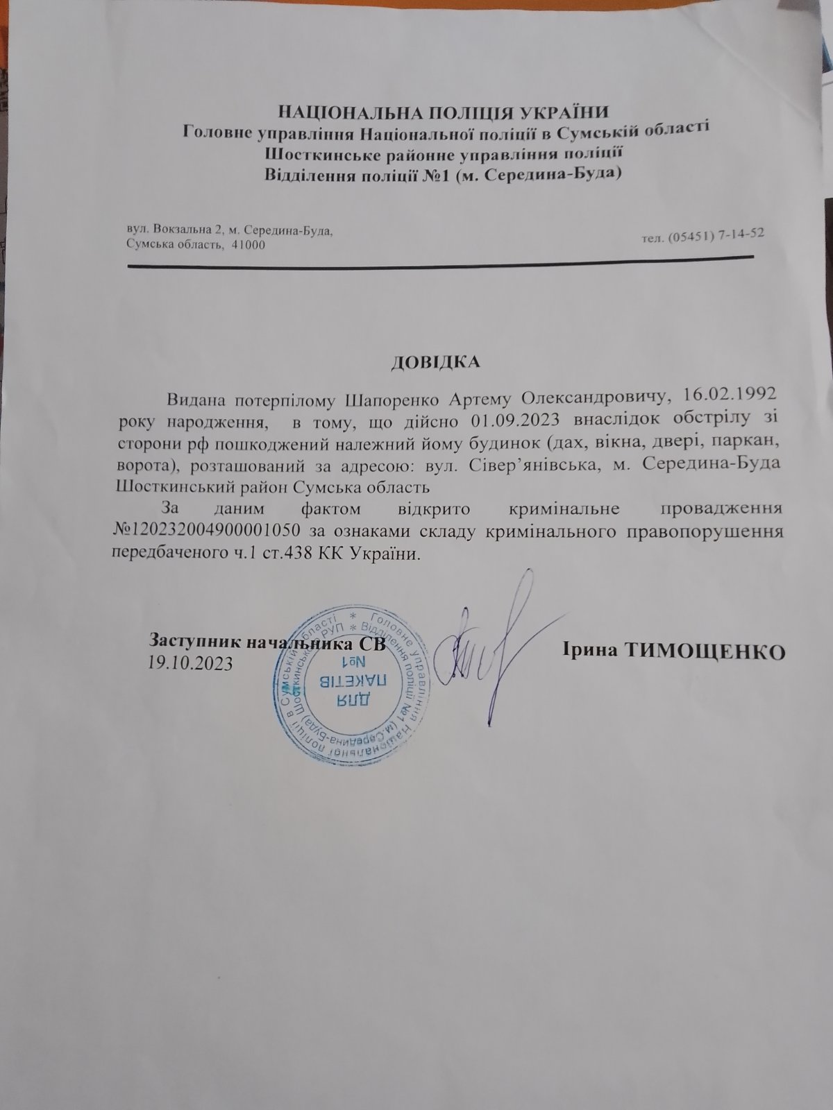 До фонду по допомогу звернулася Артем Олександрович з міста Середина-Буда, що на Сумщині. Чоловік проживає разом з дружиною та 2 дітьми, молодшій на момент обстрілу було всього 2 місяці.