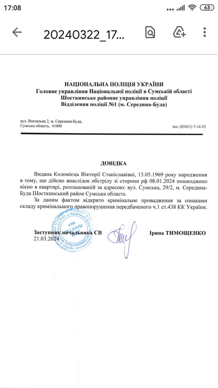 Під час одного з обстрілів міста ворожий снаряд приземлився та розірвався біля будинку жінки. Через сильний стрес у матері почалися проблеми зі здоров'ям. Вибуховою хвилею та осколками пошкоджене 1 вікно.