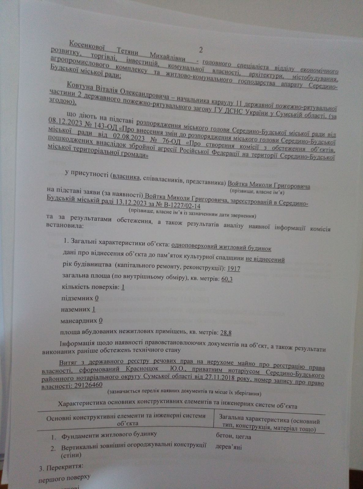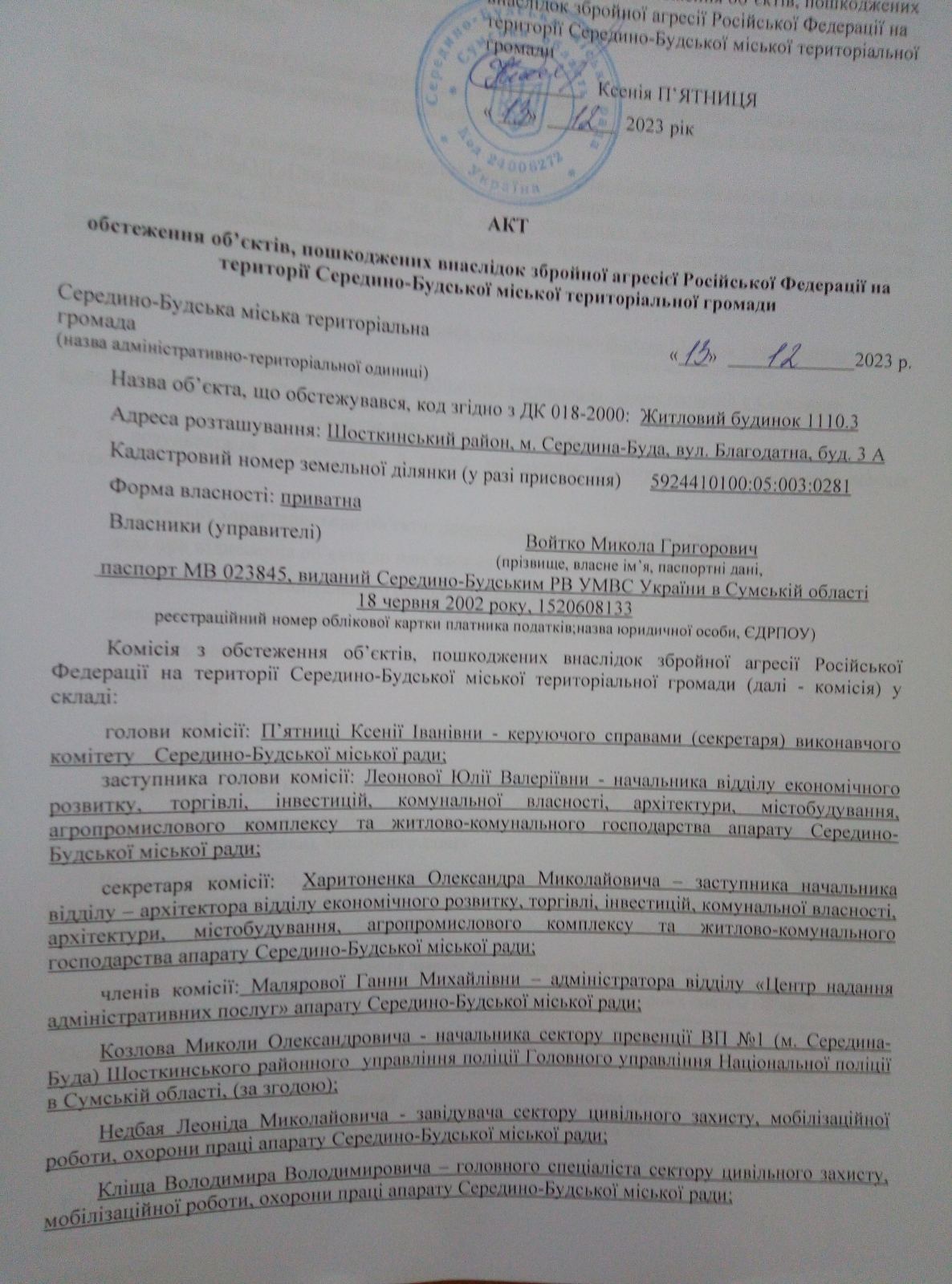 13 груденя 2023 року під час обстрілу Середино-Буди будинок пенсіонера зазнав пошкоджень. Вибуховою хвилею вибило 3 вікна. Микола Григорович з донькою в цей час були вдома. Травм не отримали, але дуже злякались, ще довго пили заспокійливі.