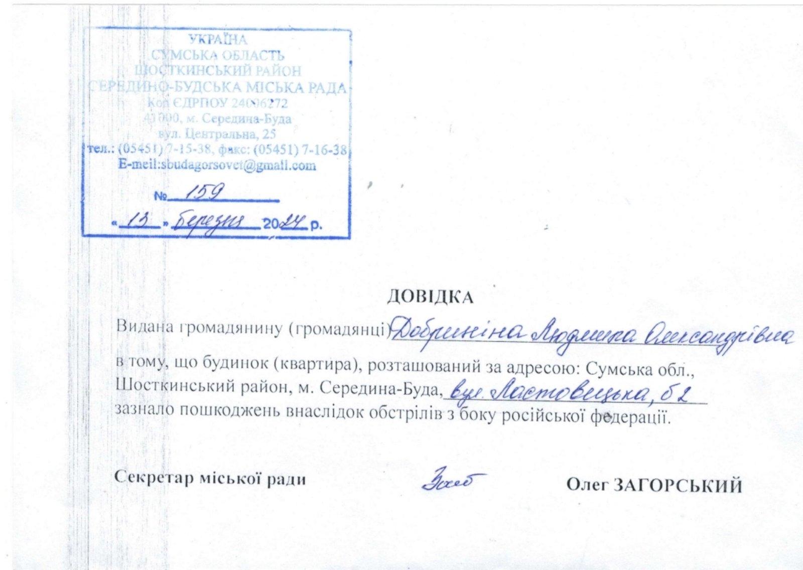 В лютому 2024 року, під час одного з багатьох обстрілів міста Середино-Буда постраждав будинок пані Людмили. Велика ділянка даху пробита ворожим снарядом.