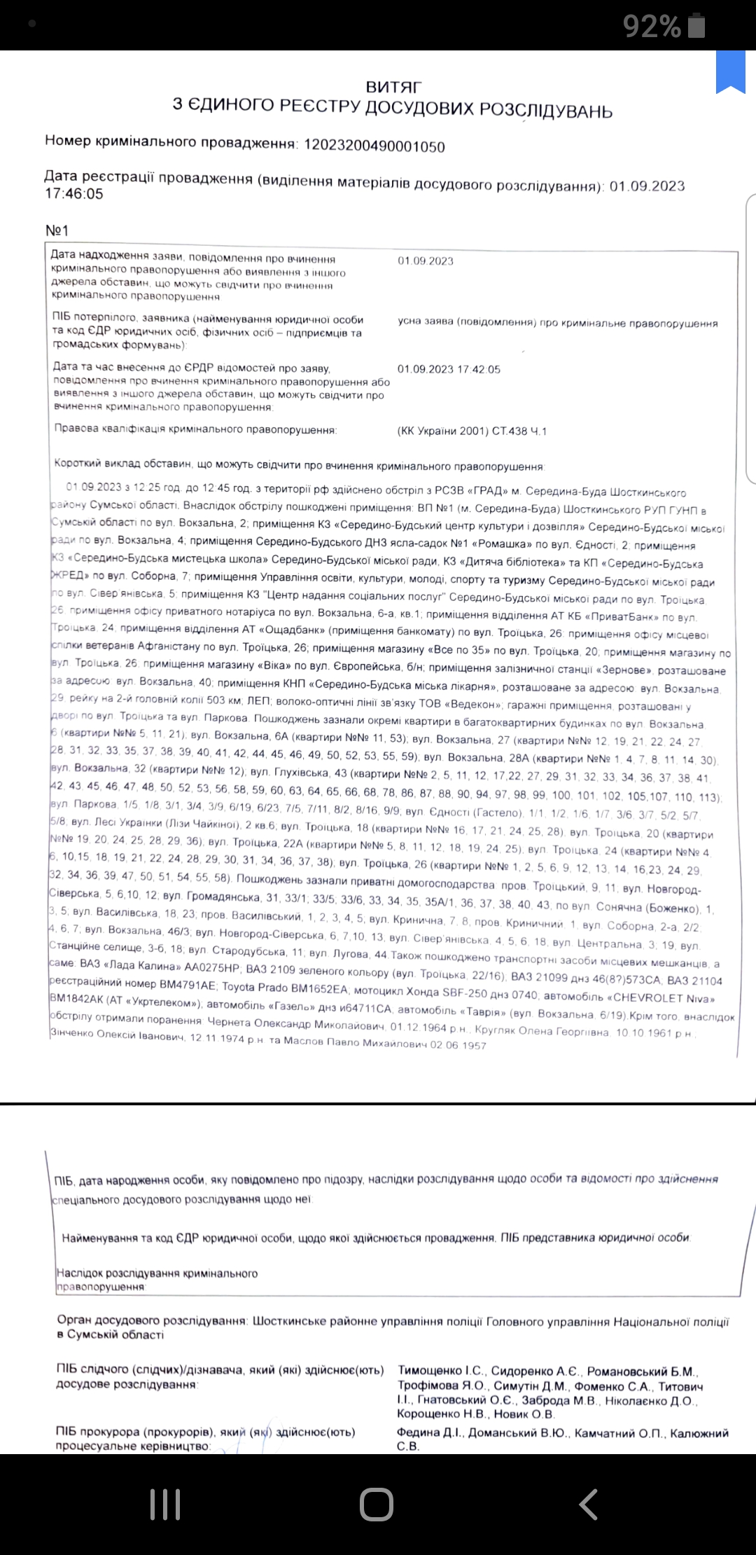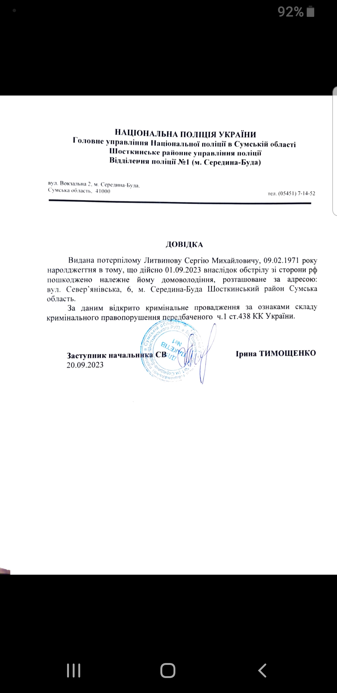 Було два обстріли: 1 вересня та 28 листопада 2023 року. Під час обстрілу вдома знаходилися батько з дитиною. Нажаль один з членів родини отримав психологічну травму: відбувається тремор рук, порушення сну. Сама ж заявниця приймає ліки.