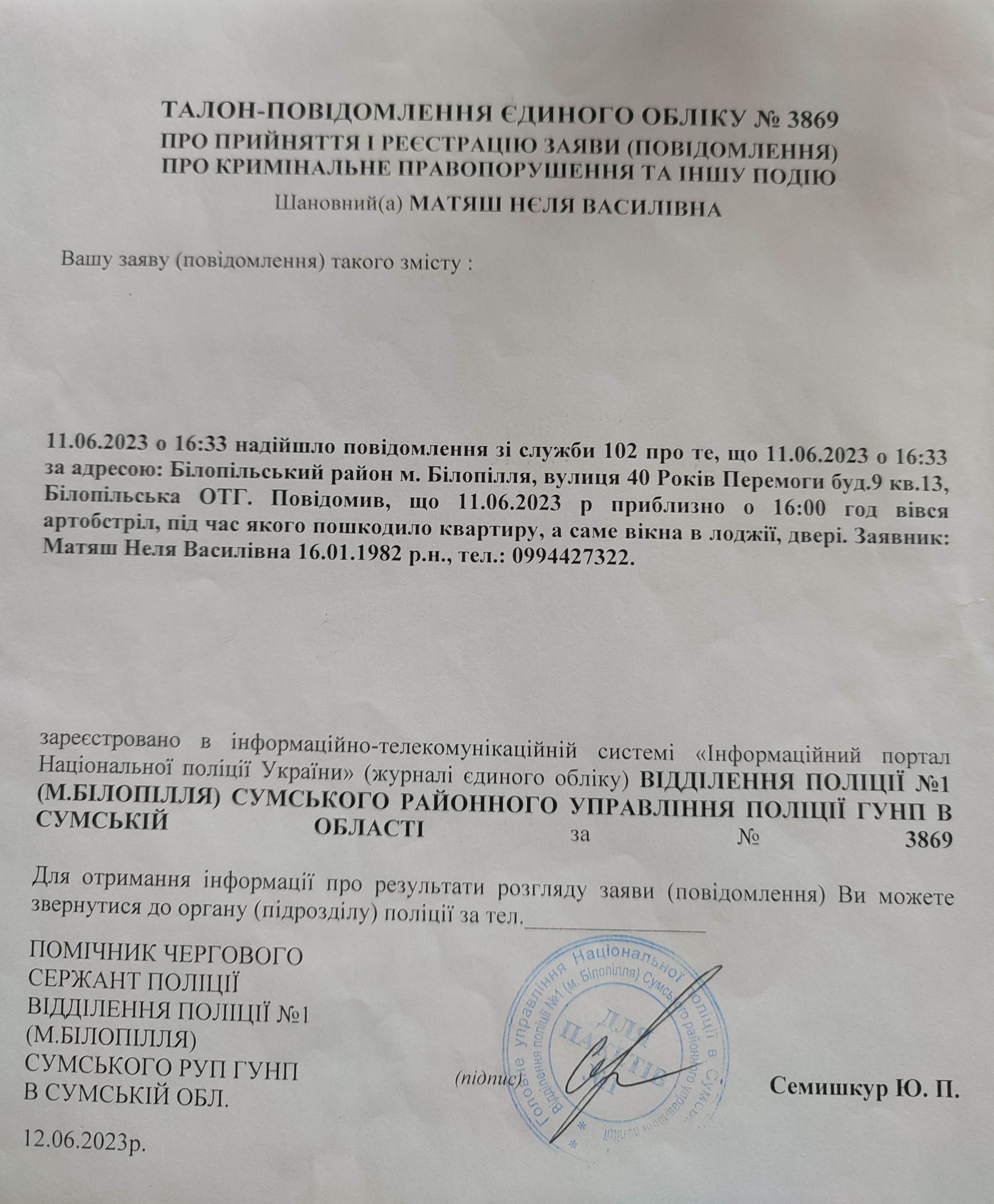 А ще, крім всіх негараздів, її будинок потрапив під один з російських обстрілів. Це сталося 11 червня 2023 року. Люди тоді гостювали у сестри заявниці, тож, на щастя, не постраждали. Але у їхній домівці вибито два вікна.