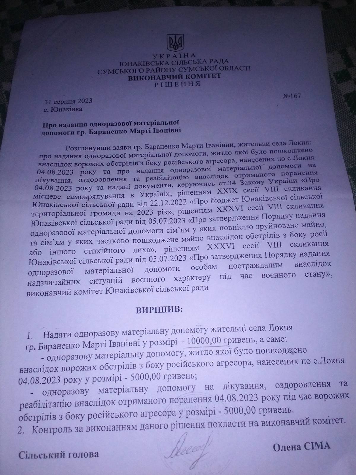 У серпні 2023 р. будинок пенсіонерки попав під обстріл, було пошкоджено 4 вікна та дах. Ударною хвилею жінку відкинуло в іншу кімнату, в шоковому стані вона побігла до підвалу. Пенсіонерка отримала поранення руки та ноги, довелося зашивати, крім цього, тепер жінка страждає від безсоння та тривожності. Наразі, вона відновлюється на Закарпатті.