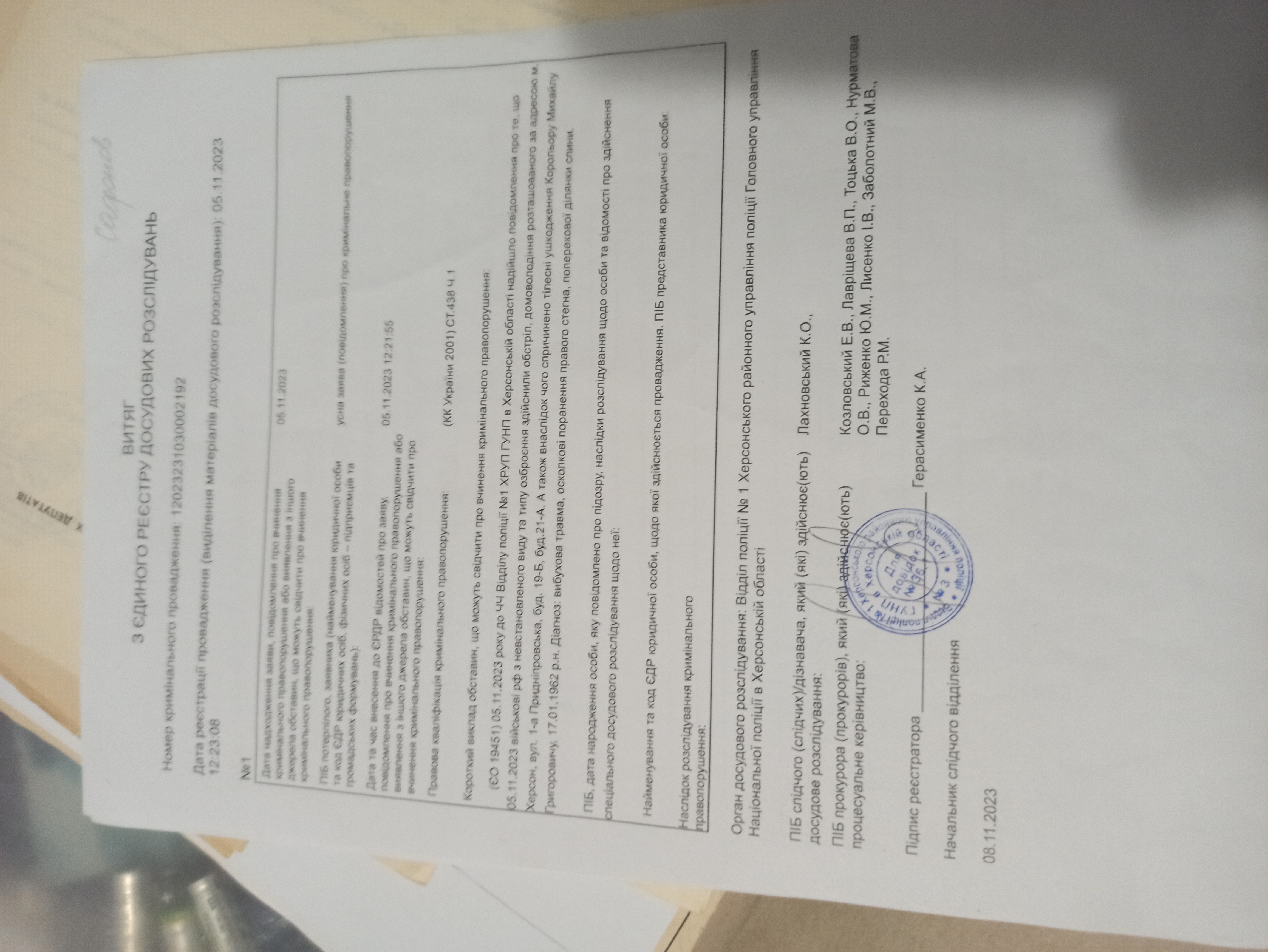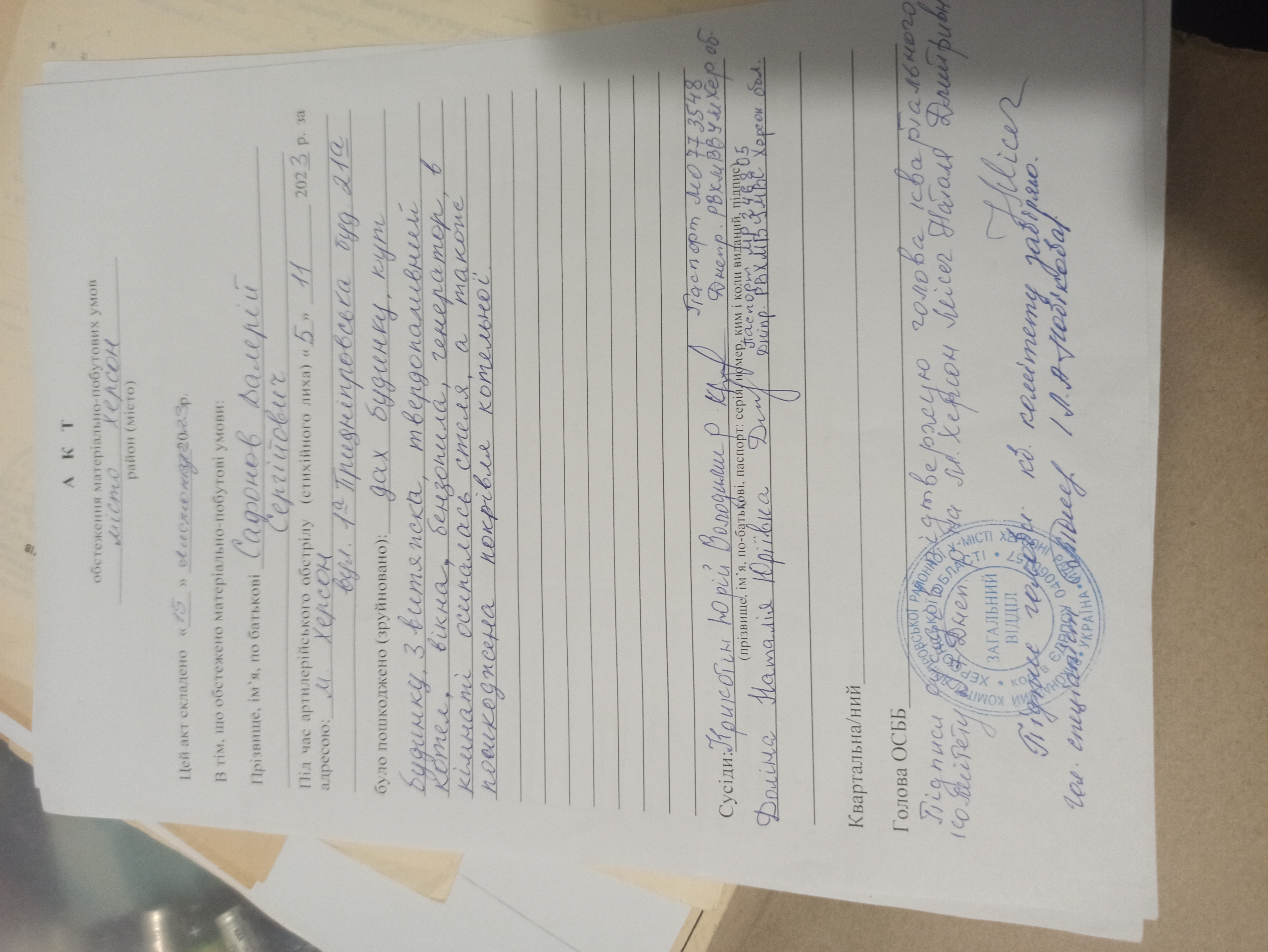 Пенсіонер Валерій Сергійович з Херсону разом з дружиною вимушений тимчасово жити у свого сина. 5 листопада 2023 р. їх будинок попав під обстріл. Було пошкоджено 3 вікна, 350 цеглин, двері та 72 м² даху.