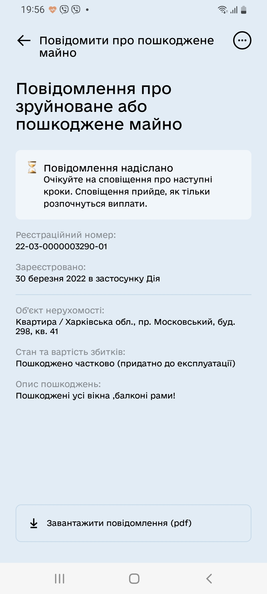 Під час обстрілів родина перебувала в бомбосховищі. На щастя фізично ніхто не постраждав, але були отримані психологічні травми. Самотужки родина замінила вікна, але двері та балкони змоги відремонтувати не мають.