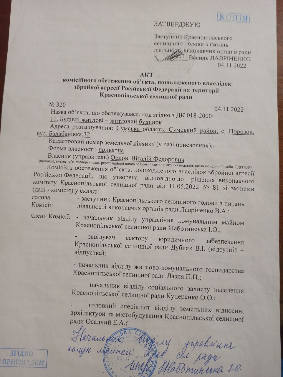 3 листопада 2023 р. стався масований обстріл населеного пункту, в результаті пряме влучення ракети у дах будинку родини. Було пошкоджено 6 вікон, паркан, стіни, автівка, 186 м² даху та промислова техніка. Обвалилась стеля, постраждали речі в будинку. Будинок непридатний до життя.